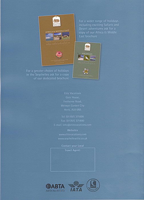 A travel brochure for holidays in Indian Ocean destinations with Elite Vacations. There is a three-page section on Madagascar.