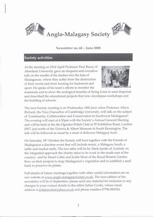 The June 2008 issue of the Anglo-Malagasy Society Newsletter covers society activities, news from Madagascar, an overview of economic developments, and news of recent Anglo-Malagasy cooperation. There is also a profile of the UK charity Azafady.