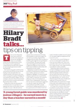 A page from the September 2012 issue of Wanderlust magazine. In this article, Hilary Bradt discusses how to decide how much to tip when travelling, with examples and illustrative stories from Madagascar.