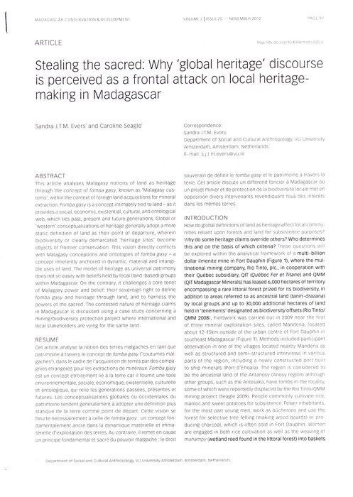 Stealing the sacred: Why 'global heritage' discourse is perceived as a frontal attack on local heritage-making in Madagascar