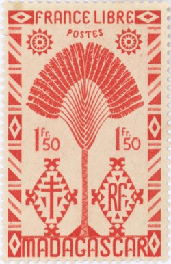 A red definitive stamp depicting a stylised ravenala tree (traveller's palm) with a geometric design. It was issued in 1943 and has a face value of 2 francs.