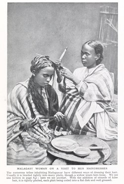 The numerous tribes inhabiting Madagascar have different ways of dressing their hair. Usually it is braided tightly into many plaits, though a widow wears hers loose. We see one fashion in page 841; here we see another. With the addition of strands of false hair, it is tightly plaited, each plait being coiled into a flat disk and well greased.