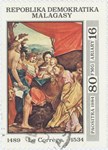 A commemorative stamp depicting Antonio da Correggio's The Madonna and Child with Saints Jerome and Mary Magdalene and Angels. It was issued on 5 May 1984 and has a face value of 80 francs (16 ariary). The stamp is cancelled with a postmark that is indistinct.