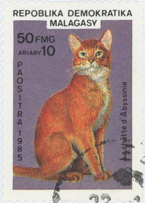 A commemorative stamp depicting an Abyssinian cat. It was issued on 25 April 1985 and has a face value of 50 francs (10 ariary). The stamp is cancelled with a postmark that is indistinct.