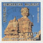 A commemorative stamp depicting a view of the Reine de l'Isalo rock formation at Isalo National Park. It was issued on 29 May 1989 and has a face value of 70 francs (14 ariary). The stamp is cancelled with a postmark that is from Tananarive, dated 18 September 1991.