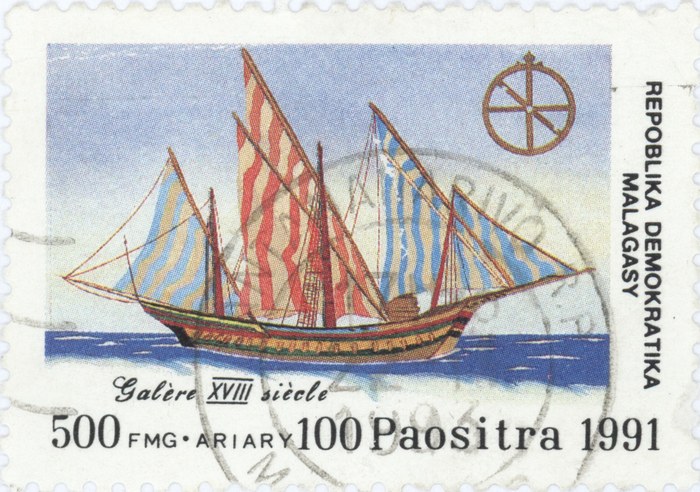 A commemorative stamp depicting an 18th-century galley. It was issued on 10 September 1991 and has a face value of 500 francs (100 ariary). The stamp is cancelled with a postmark that is from Antananarivo, daetd 1996.