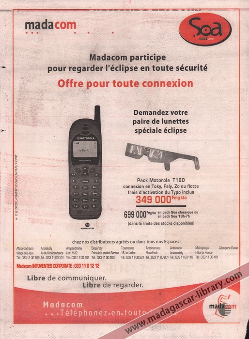 A full-page advertisement for Madacom mobile telephone operator featuring a special eclipse glasses offer.