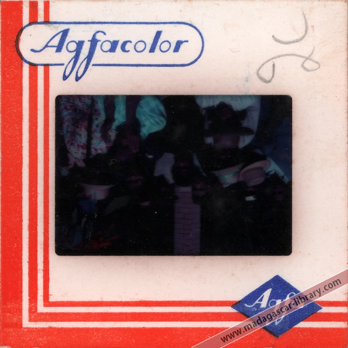 • When this collection of 237 slides was donated to the Madagascar Library in 2010, it was accompanied by an original index of 273 captions, so evidently a few slides had been lost over the years. Furthermore, the slides were not individually labelled and their sequence did not tally with the index. It is therefore possible that in a few cases slides may have been matched with the wrong caption during cataloguing. If you think this slide is incorrectly titled, please get in touch.