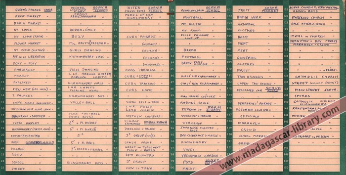 This is the first of two sheets comprising the original index to a set of 237 photographic slides from the visit of Quaker Overseas Volunteer Francis Hambly to Madagascar in 1963.
