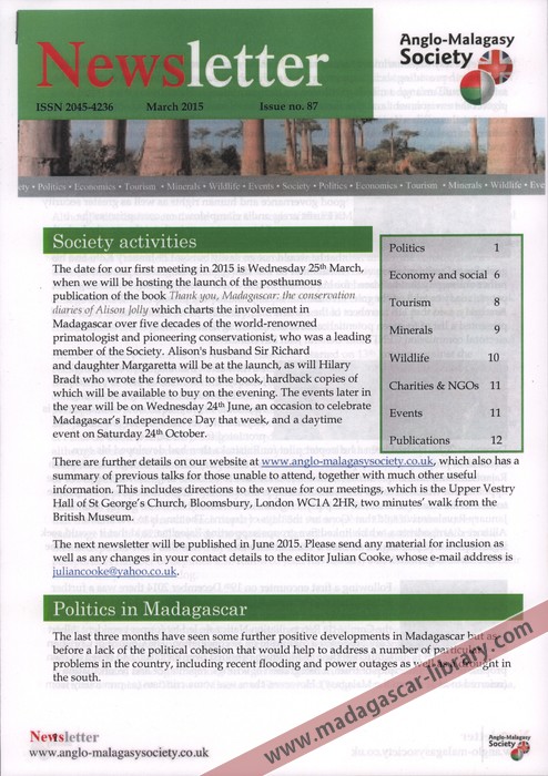 | Anglo-Malagasy Society NewsletterNo. 87 (March 2015) |