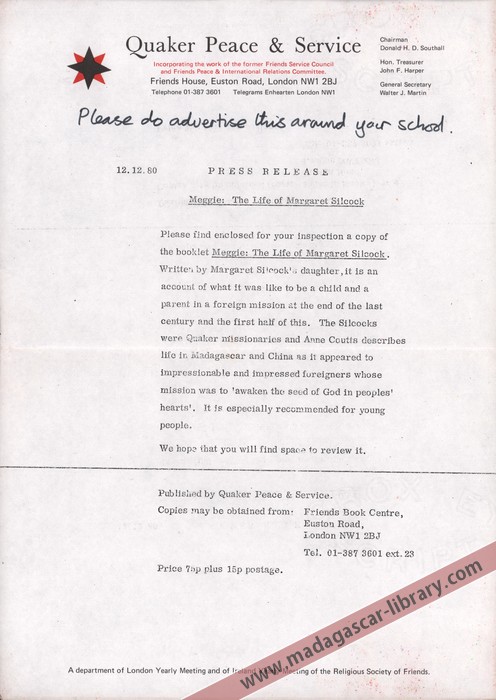 A press release, dated 12 December 1980, announcing the publication of the booklet "Meggie: The Life of Margaret Silcock".