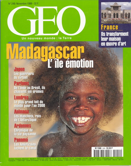 The cover feature of this issue of the French edition of GEO magazine is an article about Madagascar. This in-depth 37-page feature is entitled "Madagascar: La grande émotion" ["Madagascar: The great emotion"] and is divided into eight sections written by four different authors and assembled by Jean-Luc Coatalem. The report is illustrated with 49 colour photographs by Pascal Maitre and a large fold-out map of Madagascar by Léonie Schlosser.